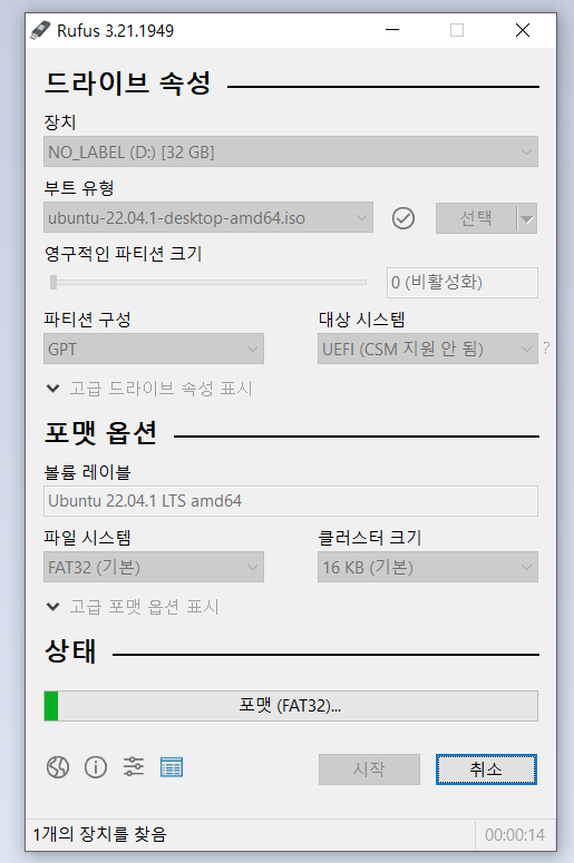Rufus를 사용하여 Ubuntu 부팅 USB를 만들고 기존 Windows OS를 지운뒤 Ubuntu를 설치하도록 하겠습니다.