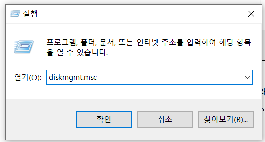 -> windows키 + R 실행 -> diskmgmt.msc 실행